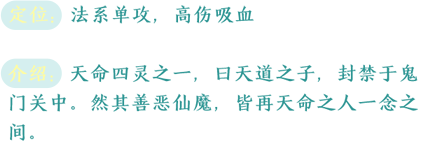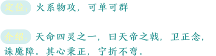 降低速度火攻敌方单体,降低其大量物防,疯魔时可降低受到的治疗